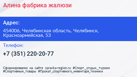 Алина, фабрика жалюзи по адресу 454006, Челябинская область, Челябинск, Красноармейская, 53 в дальнейшем Организация, размещена в следующих категориях: