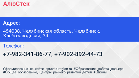 АлюСтек по адресу 454038, Челябинская область, Челябинск, Хлебозаводская, 34 в дальнейшем Организация, размещена в следующих категориях:
