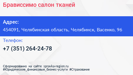 Брависсимо, салон тканей по адресу 454091, Челябинская область, Челябинск, Васенко, 96 в дальнейшем Организация, размещена в следующих категориях: