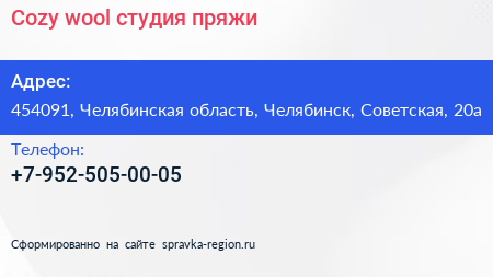 Cozy wool, студия пряжи по адресу 454091, Челябинская область, Челябинск, Советская, 20а в дальнейшем Организация, размещена в следующих категориях: