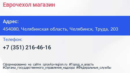 Еврочехол, магазин по адресу 454080, Челябинская область, Челябинск, Труда, 203 в дальнейшем Организация, размещена в следующих категориях: