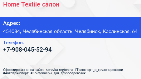 Home Textile, салон по адресу 454084, Челябинская область, Челябинск, Каслинская, 64 в дальнейшем Организация, размещена в следующих категориях: