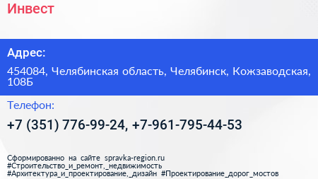 Инвест по адресу 454084, Челябинская область, Челябинск, Кожзаводская, 108Б в дальнейшем Организация, размещена в следующих категориях: