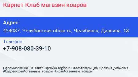 Карпет Клаб, магазин ковров по адресу 454087, Челябинская область, Челябинск, Дарвина, 18 в дальнейшем Организация, размещена в следующих категориях: