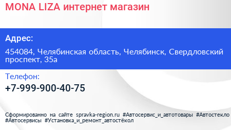 MONA LIZA, интернет-магазин по адресу 454084, Челябинская область, Челябинск, Свердловский проспект, 35а в дальнейшем Организация, размещена в следующих категориях: