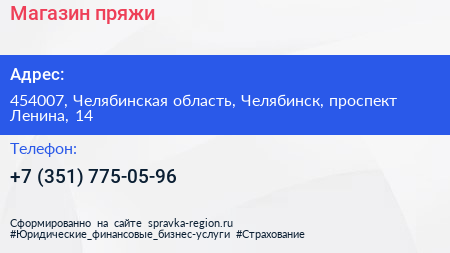 Магазин пряжи по адресу 454007, Челябинская область, Челябинск, проспект Ленина, 14 в дальнейшем Организация, размещена в следующих категориях: