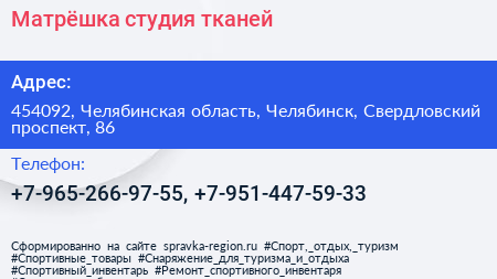 Матрёшка, студия тканей по адресу 454092, Челябинская область, Челябинск, Свердловский проспект, 86 в дальнейшем Организация, размещена в следующих категориях: