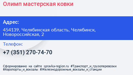 Олимп, мастерская ковки по адресу 454139, Челябинская область, Челябинск, Новороссийская, 2 в дальнейшем Организация, размещена в следующих категориях: