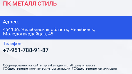 ПК МЕТАЛЛ СТИЛЬ по адресу 454136, Челябинская область, Челябинск, Молодогвардейцев, 45 в дальнейшем Организация, размещена в следующих категориях: