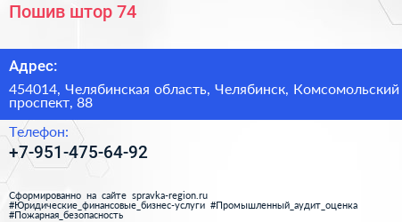 Пошив штор 74 по адресу 454014, Челябинская область, Челябинск, Комсомольский проспект, 88 в дальнейшем Организация, размещена в следующих категориях: