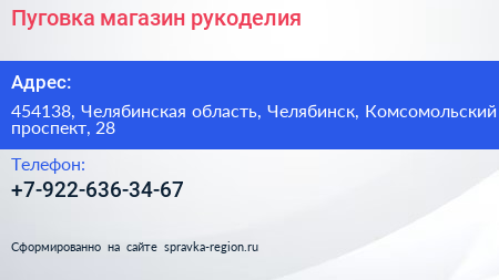 Пуговка, магазин рукоделия по адресу 454138, Челябинская область, Челябинск, Комсомольский проспект, 28 в дальнейшем Организация, размещена в следующих категориях: