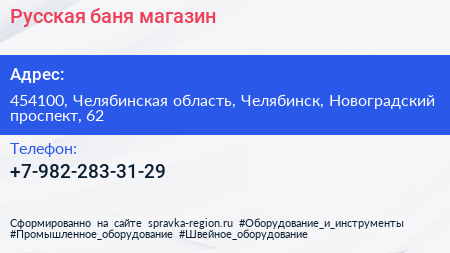 Русская баня, магазин по адресу 454100, Челябинская область, Челябинск, Новоградский проспект, 62 в дальнейшем Организация, размещена в следующих категориях: