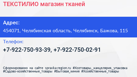 ТЕКСТИЛИО, магазин тканей по адресу 454071, Челябинская область, Челябинск, Бажова, 115 в дальнейшем Организация, размещена в следующих категориях: