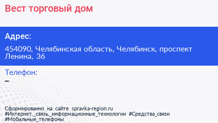 Вест, торговый дом по адресу 454090, Челябинская область, Челябинск, проспект Ленина, 36 в дальнейшем Организация, размещена в следующих категориях: