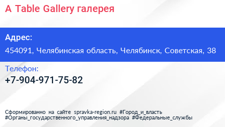 A Table Gallery, галерея по адресу 454091, Челябинская область, Челябинск, Советская, 38 в дальнейшем Организация, размещена в следующих категориях: