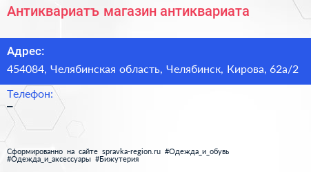 Антиквариатъ, магазин антиквариата по адресу 454084, Челябинская область, Челябинск, Кирова, 62а/2 в дальнейшем Организация, размещена в следующих категориях:
