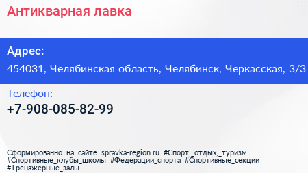 Антикварная лавка по адресу 454031, Челябинская область, Челябинск, Черкасская, 3/3 в дальнейшем Организация, размещена в следующих категориях: