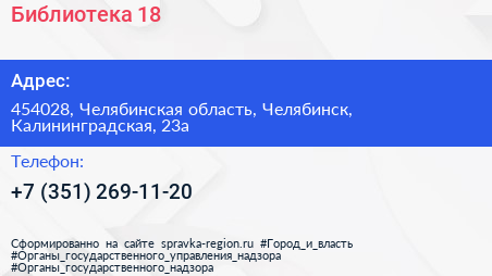 Библиотека №18 по адресу 454028, Челябинская область, Челябинск, Калининградская, 23а в дальнейшем Организация, размещена в следующих категориях: