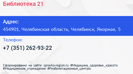 Библиотека №21 по адресу 454901, Челябинская область, Челябинск, Якорная, 5 в дальнейшем Организация, размещена в следующих категориях: