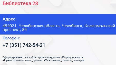 Библиотека №28 по адресу 454021, Челябинская область, Челябинск, Комсомольский проспект, 85 в дальнейшем Организация, размещена в следующих категориях: