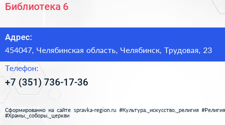 Библиотека №6 по адресу 454047, Челябинская область, Челябинск, Трудовая, 23 в дальнейшем Организация, размещена в следующих категориях: