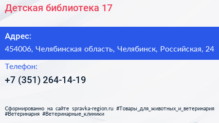 Детская библиотека №17 по адресу 454006, Челябинская область, Челябинск, Российская, 24 в дальнейшем Организация, размещена в следующих категориях: