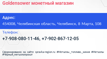 Goldensower, монетный магазин по адресу 454008, Челябинская область, Челябинск, 8 Марта, 108 в дальнейшем Организация, размещена в следующих категориях: