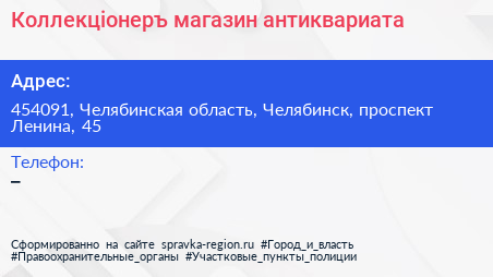 Коллекцiонеръ, магазин антиквариата по адресу 454091, Челябинская область, Челябинск, проспект Ленина, 45 в дальнейшем Организация, размещена в следующих категориях: