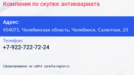 Компания по скупке антиквариата по адресу 454071, Челябинская область, Челябинск, Салютная, 23 в дальнейшем Организация, размещена в следующих категориях: