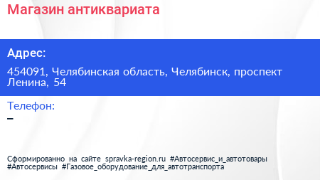 Магазин антиквариата по адресу 454091, Челябинская область, Челябинск, проспект Ленина, 54 в дальнейшем Организация, размещена в следующих категориях: