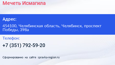 Мечеть Исмагила по адресу 454100, Челябинская область, Челябинск, проспект Победы, 398а в дальнейшем Организация, размещена в следующих категориях: