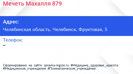 Мечеть Махалля №879 по адресу Челябинская область, Челябинск, Фруктовая, 5 в дальнейшем Организация, размещена в следующих категориях: