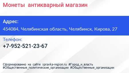Монеты+, антикварный магазин по адресу 454084, Челябинская область, Челябинск, Кирова, 27 в дальнейшем Организация, размещена в следующих категориях: