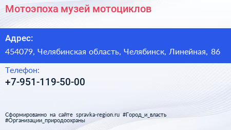 Мотоэпоха, музей мотоциклов по адресу 454079, Челябинская область, Челябинск, Линейная, 86 в дальнейшем Организация, размещена в следующих категориях: