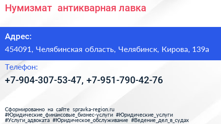 Нумизмат+, антикварная лавка по адресу 454091, Челябинская область, Челябинск, Кирова, 139а в дальнейшем Организация, размещена в следующих категориях: