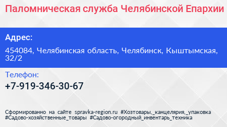 Паломническая служба Челябинской Епархии по адресу 454084, Челябинская область, Челябинск, Кыштымская, 32/2 в дальнейшем Организация, размещена в следующих категориях: