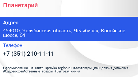 Планетарий по адресу 454010, Челябинская область, Челябинск, Копейское шоссе, 64 в дальнейшем Организация, размещена в следующих категориях: