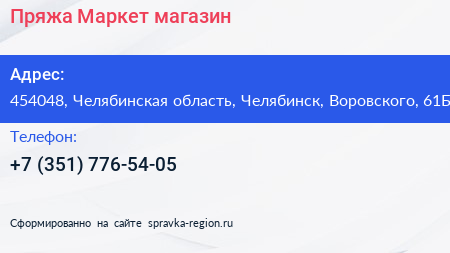 Пряжа Маркет, магазин по адресу 454048, Челябинская область, Челябинск, Воровского, 61Б в дальнейшем Организация, размещена в следующих категориях: