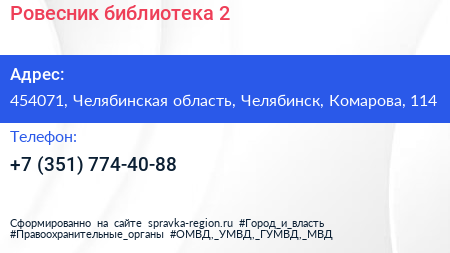 Ровесник, библиотека №2 по адресу 454071, Челябинская область, Челябинск, Комарова, 114 в дальнейшем Организация, размещена в следующих категориях: