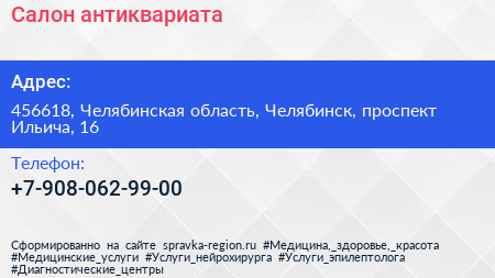 Салон антиквариата по адресу 456618, Челябинская область, Челябинск, проспект Ильича, 16 в дальнейшем Организация, размещена в следующих категориях: