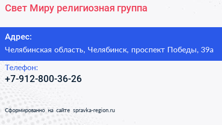 Свет Миру, религиозная группа по адресу Челябинская область, Челябинск, проспект Победы, 39а в дальнейшем Организация, размещена в следующих категориях: