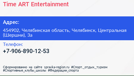 Time АRТ Entertainment по адресу 454902, Челябинская область, Челябинск, Центральная (Шершни), 3а в дальнейшем Организация, размещена в следующих категориях: