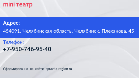 mini, театр по адресу 454091, Челябинская область, Челябинск, Плеханова, 45 в дальнейшем Организация, размещена в следующих категориях: