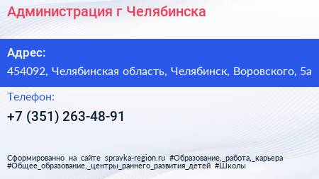 Администрация г. Челябинска по адресу 454092, Челябинская область, Челябинск, Воровского, 5а в дальнейшем Организация, размещена в следующих категориях: