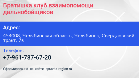 Братишка, клуб взаимопомощи дальнобойщиков по адресу 454008, Челябинская область, Челябинск, Свердловский тракт, 7в в дальнейшем Организация, размещена в следующих категориях: