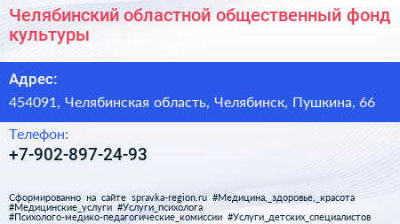 Челябинский областной общественный фонд культуры по адресу 454091, Челябинская область, Челябинск, Пушкина, 66 в дальнейшем Организация, размещена в следующих категориях: