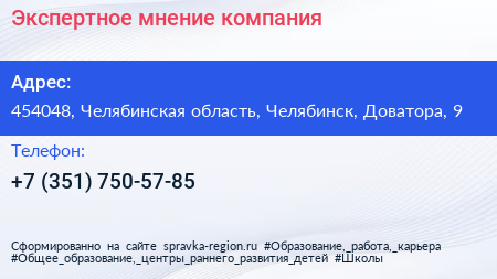 Для связи с организацией воспользуйтесь номером телефона: +7 (351) 750-57-85. Пн: c 10:00-17:00, Вт: c 10:00-17:00, Ср: c 10:00-17:00, Чт: c 10:00-17:00, Пт: c 10:00-17:00, Сб: выходной, Вс: выходной, вы можете обратиться в эту организацию.