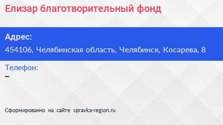 Елизар, благотворительный фонд по адресу 454106, Челябинская область, Челябинск, Косарева, 8 в дальнейшем Организация, размещена в следующих категориях: