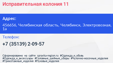 Исправительная колония №11 по адресу 456656, Челябинская область, Челябинск, Электровозная, 1а в дальнейшем Организация, размещена в следующих категориях:
