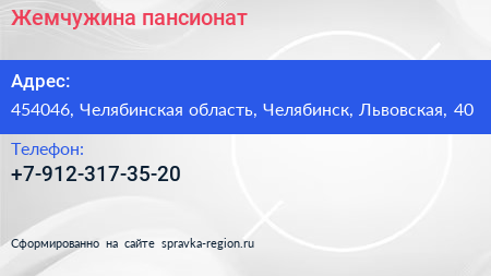 Жемчужина, пансионат по адресу 454046, Челябинская область, Челябинск, Львовская, 40 в дальнейшем Организация, размещена в следующих категориях: